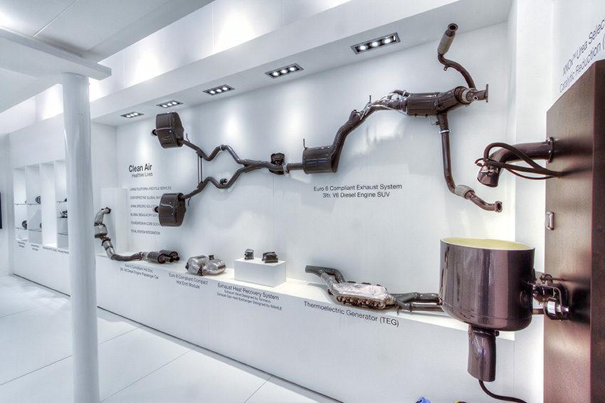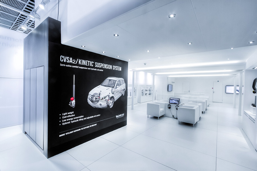 Beneden een showroomachtige produktpresentatie in een strakke heldere loungesfeer.