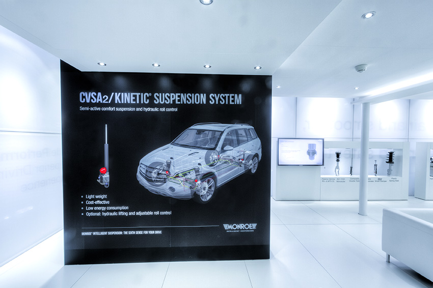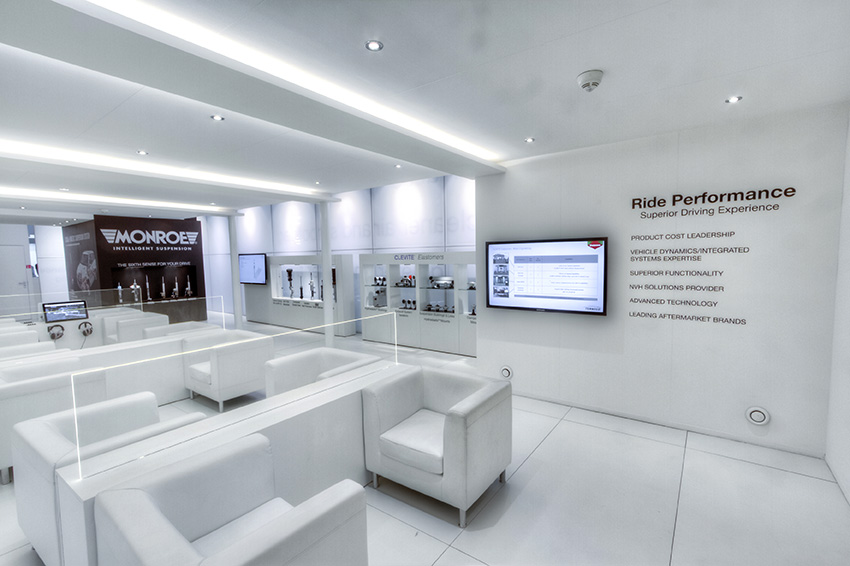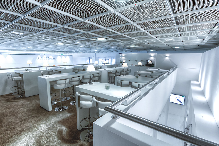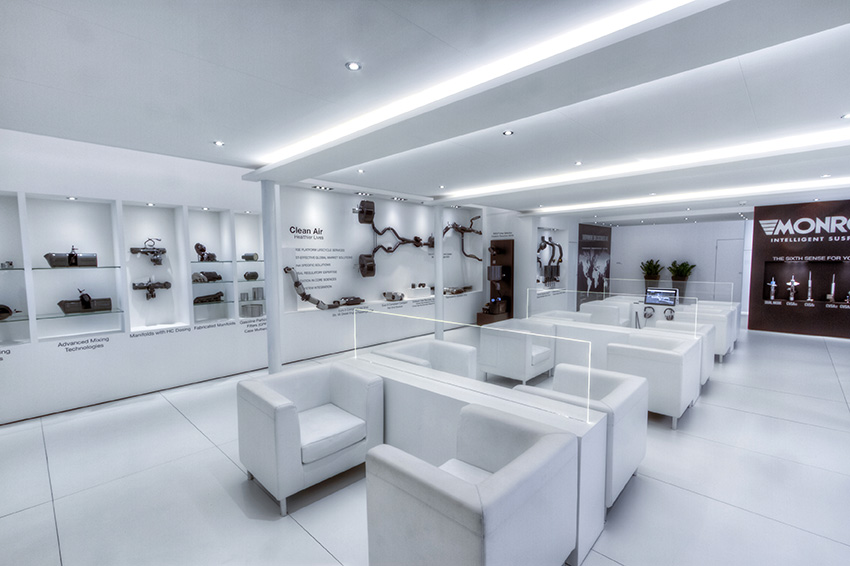 Beneden een showroomachtige produktpresentatie in een strakke heldere loungesfeer.